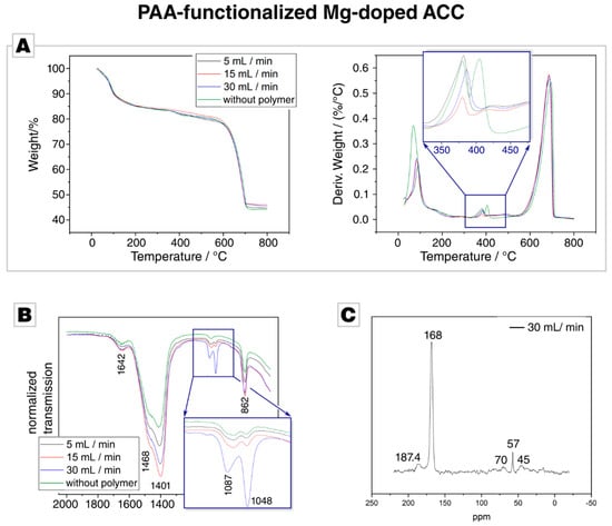(A) Thermal gravimetric analysis of the PAA experiments and the Mg-doped ACC control sample. The different PAA-functionalized samples show no significant variation. (B) Fourier transform infrared spectrum of the PAA-functionalized and the control samples; the complete spectrum is provided in Figure S3B in the Supplementary Materials. (C) CP-MAS 13C–SS-NMR of PAA-functionalized Mg-doped ACC synthesized at 30 mL/min. The signals at 39 to 48 ppm can be attributed to overlapping signals of the CH and CH2 moieties in the vinyl backbone of PAA; the signal at 185 ppm arises from carboxylic moieties of the PAA polymer. Other signals (e.g., at 57 ppm) arise from impurities, such as residual ethanol, or are uninformative to the signal/noise ratio.