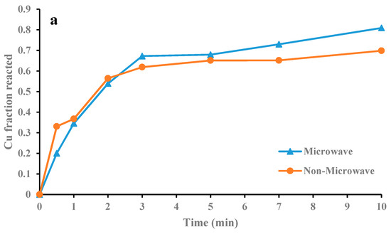 Figure 10a shows the Cu recovery in the microwave and non-microwave leaching. The final Cu recovery from CSD after 10 min in the absence and presence of microwave irradiation is 80.88% and 69.83%, respectively. The copper dissolution in non-microwave leaching is higher in the first 3 min; however, for microwave-leaching experiment Cu dissolution increases after this period. The non-microwave leaching was carried out in the water bath and the reaction temperature was constant during the process. On the other hand, the temperature reaches its highest level after 3 min (Figure 9). After this initial step, the Cu dissolution in the microwave-leaching experiment starts to increase (compare to non-microwave leaching).
