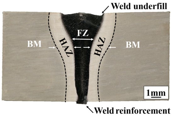 The material was processed into test plates with a size of 200 mm × 40 mm × 14 mm by means of machining, and the welding process was performed by vacuum electron beam welding. The dimensions of the test plates are shown in Figure 1. The plate segments were carefully mechanically polished and chemically cleaned to remove oxides, oil, and moisture from the surface of the plates before welding. Electron beam welding was performed with a ZD150-C high-pressure vacuum machine (SST, Werne, Germany) with the welding direction parallel to the length of the test plates for welding. The parameters of the electron beam welding process include 150 kV accelerating voltage, 2016 mA focusing current, 10 mm/min welding speed, and 43 mA welding current. Due to the electron beam oscillation during the welding process, fish scales were formed on the surface of the welded plates. Furthermore, the electron beam welded joints of TC17 alloy were divided into a fusion zone (FZ), a heat affected zone (HAZ) and a base material zone (BM) in Figure 2. The welded joint of TC17 titanium alloy was found to have an upper and lower width of ~3 and ~1 mm, respectively. Meanwhile, the weld underfill and the weld reinforcement produced by rapid cooling can be observed in the fusion zone, as shown in Figure 2.