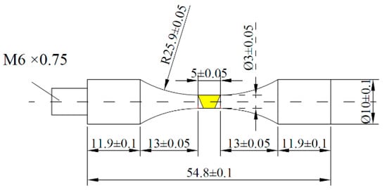 Firstly, the round bar-shaped samples were extracted from the middle of the welded plates and perpendicular to the weld direction in Figure 1. Milling of the surfaces of the samples was conducted to get rid of geometrical defects after electron beam welding, such as the welded reinforcement and welded underfill which play a role of stress concentrators and have a strong weakening effect on the fatigue life. Secondly, the samples were post-weld heat treated (PWHT) of 630 °C for 2 h in air cooling [15] to remove the welded residual stresses. Lastly, the round bar-shaped samples were processed into very high cycle fatigue specimens after heat treatment. The specimen geometry was designed to a smooth cylindrical (dog-bone) shaped fatigue specimen, ensuring that the fusion zone, the heat-affected zone, and the base metal with the same external loading and meeting the resonance requirement of 20 kHz. The calculated dimensions of the specimen are shown in Figure 3. Before the experiment, the middle parallel section, and the arc over the section of the fatigue specimen were polished to the mirror state and corroded with Keller’s reagent (10 mL HF+ 15 mL HNO3 + 75 mL H2O).