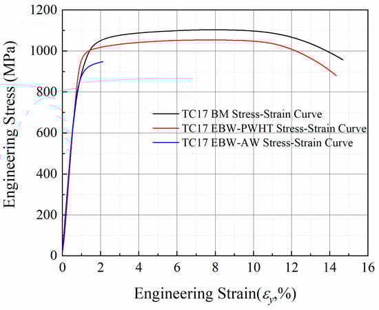 Stress-strain curves of the base metal, as-welded TC17 EBW joint, and PWHT of TC17 EBW joint.