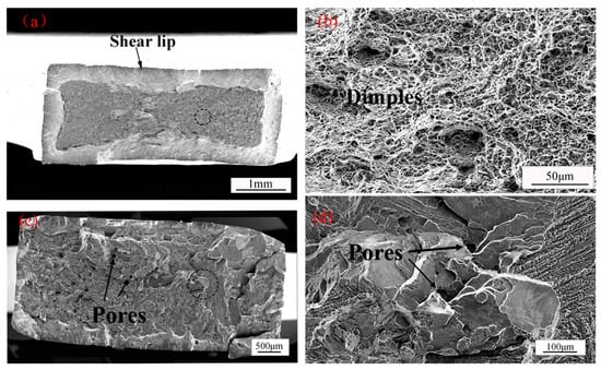 The stress-strain curves of the base metal, as-welded (AW), and PWHT of TC17 welded joints are shown in Figure 5. The room temperature tensile test data of TC17 EBW joints is shown in Table 2. The strength of the base metal is higher than those of as-welded joints and PWHT joints (Table 2). The tensile strength of the as-welded TC17 EBW joints is about 948 MPa under nominal stress that is almost 86% of the tensile strength of the base metal (1103 MPa). The as-welded joints show almost no ductility and fail just beyond the yield strength. However, the as-welded joints restored the strength and ductility of the joints by PWHT. The tensile strength of the welded joint of TC17 titanium alloy by post-weld heat treatment is about 1053 MPa, which means nearly about 95.5% of the strength of the base metal, and the elongation of fracture is about 17%. Compared with the as-welded TC17 EBW joint, the tensile strength is increased by about 10% of TC17 EBW joint by PWHT. The as-welded joints fractured from the fusion zone. Nevertheless, the PWHT welded joints fractured from base metal. This showed that PWHT was effective in increasing the strength of the fusion zone. Since the heat treatment released the internal stress generated by the welding and caused a transition between α phases and β phases in the FZ and the HAZ. During the heat treatment process, supersaturated solid solution β phases with martensitic α’ phases were transformed into secondary α lamella embedded in the β matrix, which could enhance the mechanical behavior of TC17 EBW joint [15]. Fracture observation showed that the PWHT of TC17 alloy EBW joint undergone ductile fracture under tensile action, which has an obvious shear lip in Figure 6a. In addition, a large number of dimples are distributed on the final failure fracture in Figure 6b. Nevertheless, the as-welded TC17 EBW joint undergone brittle fracture under tensile action. Figure 6c,d showed the fracture surface of as-welded specimens is brittle fracture with cleavage planes. Besides, the welded pores on the surface fracture can be observed.