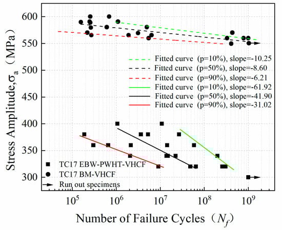 Figure 7 shows the S-N curves of the welded joints with PWHT and BM of TC17 titanium alloy. The data for runout specimens at 109 cycles is marked with an arrow (Figure 7). The results show that the S-N curves of the welded joints are linearly decreasing with an increase in the number of cycles. The fatigue failure is observed even beyond 107 cycles which shows that the traditional fatigue limit is not there. As the fatigue life of welded joints ranges from 1.88 × 105 to 1.00 × 109 cycles, the stress level ranges from 400 MPa to 300 MPa. The S-N curves of the specimens show large scatter as compared to the base metal S-N curves. For fatigue strength design, P-S-N curves obtained for materials with different failure probabilities are more applicable. P-S-N curves effectively solve the uncertainty introduced by the dispersion of fatigue life of materials and can be used as a more intuitive basis for fatigue strength design. Moreover, the Basquin stress-fatigue relationship was used for the fatigue life prediction of welded joints. The relationship Δσ = 511.72(2Nf)−0.022 was obtained from the fitting of S-N curves, where is the stress amplitude of test loading, and Nf is the fatigue life of TC17 EBW joints.