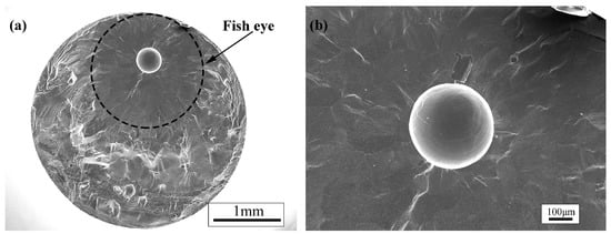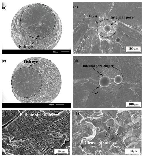 The fracture surfaces of the fatigue specimens were observed by the scanning electron microscope (SEM). The fracture locations of the fatigue specimens are distributed in the fusion zone and the heat-affected zone of welded joints of TC17 alloy regardless of the high-stress amplitude or the low-stress amplitude that is mainly due to the fusion zone. The reason is the fusion zone undergoes rapid melting and grain growth, resulting in coarse grains, and it is easy to produce the welded pores in the fusion zone during the electron beam welding process [17]. The fatigue crack initiation was observed from the welded pores distributed in the internal, subsurface and surface of the TC17 EBW joints. There are obvious characteristics of crack initiation zone, crack propagation zone and final failure zone on the fracture of the welded joints. Figure 8 shows the fracture surfaces of the welded joints loaded with 400 MPa and 360 MPa. It can be clearly observed the fracture surface has a "fisheye" region around the pore from where the crack initiation took place, as shown by the dotted circle in Figure 8a,c. The fracture surface is smooth and flat, forming a radial decorative pattern centered on the pores. A distinct fine granular area (FGA) called by Sakai et al. [28] and fracture caused by transgranular crack propagation were observed around the pores in the "fisheye" region. The section is rough with high-density cleavage planes outside the "fisheye" region, as shown in Figure 8f. Under the high-power electron microscope, the fatigue striations could be observed in the crack propagation zone perpendicular to the crack propagation direction, as shown in Figure 8e. This shows a high number of fatigue cycles consumed in the crack initiation and early propagation, even reaching the majority of the total fatigue life [22,29,30]. The upper and lower crack faces are pressed against each other to form a smooth and flat "fisheye" region, and later the fatigue cracks propagated rapidly forming rough cleavage planes [22]. In some cases, the crack initiation was observed from the cluster of multiple pores. The FGA from the cluster of multiple pores is similar to those with single pore, as shown in Figure 8b. Moreover, it was found that when there is the pore cluster in the initiation zone, the fatigue life is still reduced even under low-stress amplitude. It can be said that the increase in the number of pores results in a larger area of stress concentration to reduce the fatigue life. Multiple short cracks around the pores emanate and coalescence to form long cracks reducing the fatigue life of the welded joints. Figure 9 shows the fracture surface of specimen loaded with 340 MPa stress. The fracture surface of specimen shows a fisheye without FGA region around a large pore size (200 μm diameter). In other words, the fatigue cracks stride over the initiation zone and directly enter the early propagation area. It is worth noting that for the non-metallic inclusions in the welded joints of high-strength steel, it was found that the size and position of non-metallic inclusions are closely related to the fatigue life of the material. Meanwhile, a new "Z" parameter fatigue life prediction model is proposed based on the Murakami model, which is related to the local stress concentration and the defects size and location [19,31]. Therefore, the number of pores, the size of pores and the location of pores in the initiation zone will play a crucial role in the very long fatigue life of the welded joint. The mechanism of the influence of the welded pores for the fatigue life will be described in detail in the following sections.