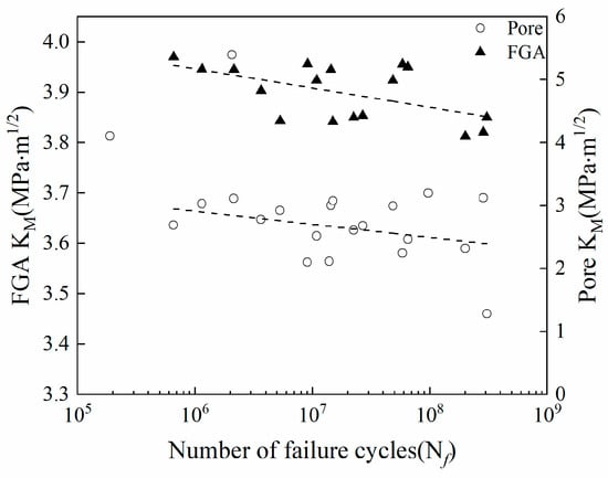 The stress intensity factor amplitudes KM of FGA are distributed between 3.81 and 3.96 MPa·m1/2 (Figure 10). The stress intensity factors of FGA decrease with an increase in the fatigue cycles of the welded joint. However, it has been found in earlier studies [23,28,36] that the KFGA is a constant independent of the fatigue life which is related to the threshold value of the crack propagation. It can be found that the stress intensity factor corresponding to the pores originating from the crack origin of the welded joint decreases with an increase in the fatigue cycles. Whereas, the pore clusters are distributed in the FGA, as shown in Figure 8. A linear fit was performed on the two sets of data, and it was found that the two fitted straight lines were approximately parallel, showing the same downward trend. Therefore, it can be said that the pores change in KFGA resulting in the inverse relationship between KFGA and the fatigue life of the welded joint. The conventional method for calculating the FGA stress intensity factor is not suitable for the welded joint due to the pores. In order to avoid the influence of the pores on the stress intensity factor of FGA, Equations (2) and (3) are revised, and the modified formulas are proposed for calculation of the effective FGA stress intensity factor of the welded joint. When crack initiation occurs from the surface pores: