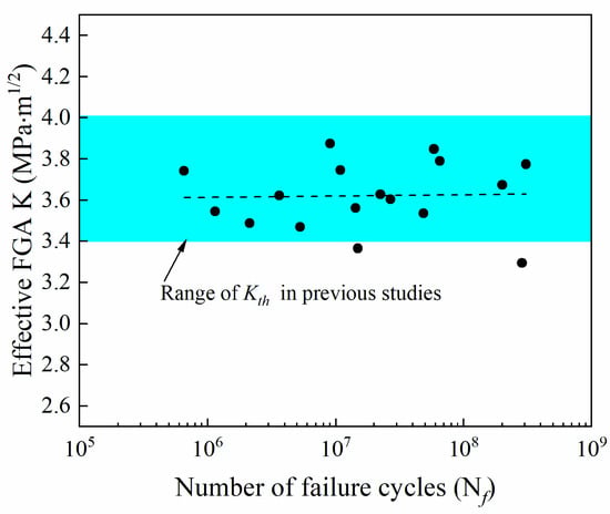 where is the maximum projected area of the FGA perpendicular to the tensile stress plane, is the sum of the maximum projected areas of the respective pores perpendicular to the tensile stress planes. The variation in the effective FGA stress intensity factor with fatigue cycles to failure is shown in Figure 11. By linearly fitting the calculation results, it can be seen that the effective FGA stress intensity factor of KFGA does not change with the number of cyclic loadings and remains substantially constant. For titanium alloys, the crack initiation threshold (Kth) obtained from many previous experimental results [36,40,41] is 3.4~4.0 MPa·m1/2. Considering the measurement error and calculation accuracy, the average value of KFGA obtained by this work is 3.62 MPa·m 1/2 which is included in the crack propagation threshold of titanium alloy. Therefore, the stress intensity factors of KFGA are the effective threshold for fatigue crack propagation of welded joints of TC17 titanium alloy. In the current study, similar fine granular areas are found in special areas with high fatigue life, and the stress intensity factor of KM is also close to Kth. This characteristic area has intrinsic existence during very high cycle fatigue regime.