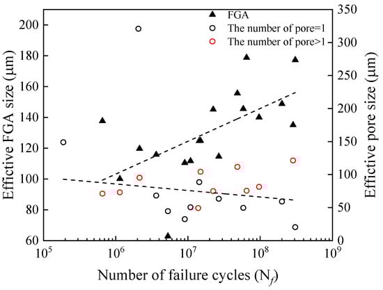The above discussion shows that the pores affect the calculation of KFGA, and make the original KFGA in the initiation zone correlate with fatigue life to a certain extent. Therefore, the pores affect the stress-life relationship of welded TC17 alloy joints, and the data show greater dispersion (Figure 7). In this paper, the effective size of pores, the relative depth of pores and the number of the pores in the initiation zone of the welded joint specimen are counted. Figure 12 is a diagram of the relationship between the effective sizes of pores and FGA and fatigue life in the fracture initiation zone of welded TC17 alloy joint. The effective sizes of the pores were calculated from the square root of the total area of the pores in the initiation zone. The effective sizes of FGA were calculated by the square root of the effective FGA area. The red ring indicates that the number of pores in the fatigue crack initiation zone is greater than 1. However, the black ring indicates the number of the pores in the fatigue crack initiation zone is 1. When the number of cyclic loadings is less than 107 cycles, the size distribution of effective FGA is dispersed, which shows the sizes of effective FGA are mainly affected by higher stress level; when the number of cyclic loadings is more than 107 cycles, that at lower stress level, the sizes of effective FGA increase with the increase of fatigue life, and their sizes range from 100 to 160 μm. For the pore cluster, with the increase of the number of cyclic loadings for the welded joints of TC17 alloy, the effective sizes of pores decrease slightly. Most of the effective sizes of pores are between 30 and 150 μm. The larger pores in the specimen show that there is a lower fatigue life of welded joints, even though under low-stress amplitude. The stress intensity factors of the pores are larger than that of KFGA due to large pores (Figure 10). The fatigue cracks skip the formation process of FGA, resulting in the absence of morphological characteristics of FGA. The stress concentration around the pores increases the stress forming the plastic slip bands leading to the crack initiation [38]. Generally, the fatigue cracks initiate from the surface, mainly in the low and high cycle fatigue regime. Therefore, it can be inferred that the fatigue life of the fatigue crack initiation on the inner surface of the pores is much shorter than that of the internal FGA mode. After a short process of cracking initiated by surface slip band, the fatigue crack propagation stage is directly entered, resulting in final failure. To the extent that the effective size of pores seriously restricts the fatigue life of welded joints of TC17 alloy.