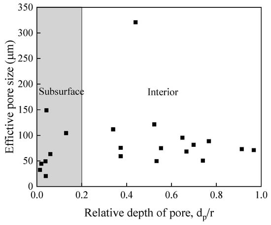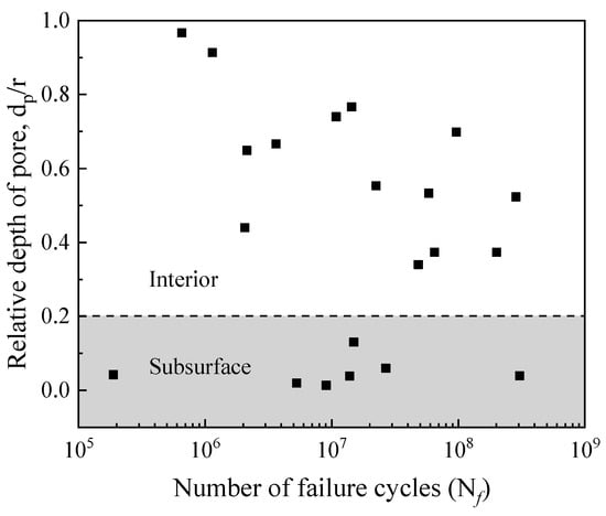 Figure 14 shows the variation in the relative depths of the pores (dp/r) [31] with the fatigue life of the specimen. Here dp is the closest distance between the center of the pores and the surface of the specimen. The r is the radius of the specimen. The fatigue life of the specimen was found to be increasing with the decrease in the relative depths of pores. The pores are randomly distributed in the specimens and there is no relationship between the relative depths of pores and their sizes, as shown in Figure 15. In summary, when the number of cyclic loadings is less than 107 cycles (high or low cycles regime), the higher loading stress level determines the fatigue life of welded joints, and the influence of pores on the fatigue life of welded joints is small. When the number of cyclic loadings is greater than 107 cycles, the sizes of effective FGA around the pores increase. Meanwhile, the effective sizes and the relative depths of the pores determine the very long fatigue life of welded joints. When the stress intensity factor of FGA reaches ~3.4–3.6 MPa·m1/2, the cracks propagate leading to failure.