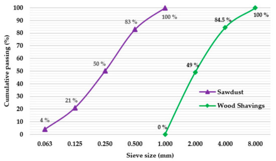 When the material was received, the wood waste was submitted to a surface cleaning process, using wire brushes, to eliminate any possible sand/dirt adhered to the material. After that, the wooden pieces were crushed using a TELEMECANIQUE crusher. To obtain the sawdust (0.063–1.000 mm) and wood shavings (1.000–8.000 mm), different PROETI sieves were used, as shown in