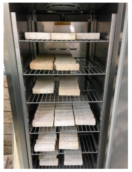 Samples were exposed to 5, 10, and 15 wetting–drying cycles in order to amplify the aggressive treatment. The wetting–drying cycles were conducted in a CCI CLIMATICA STD curing chamber (Universidad de Sevilla, Sevilla, Spain) (