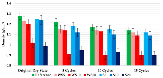 30], who also used wood waste for the development of gypsum plasters. On the other hand, it could be observed that, for all the plasters, the increase in the number of wetting–drying cycles was linked to a decrease in density in relation to those that had not been submitted to the aging process (0 cycles). The biggest drop was achieved for the WS20 samples, reducing the density of the plaster by 11.8% after 15 wetting–drying cycles. This reduction was due to loss of mass, caused mainly by the small disintegration process, that was suffered by the composites with the highest percentage of waste, when they were subjected to the wetting–drying cycles. Finally, it must be said that other studies from the literature also achieved an important reduction in the density of the materials when they were submitted to wetting–drying cycles [