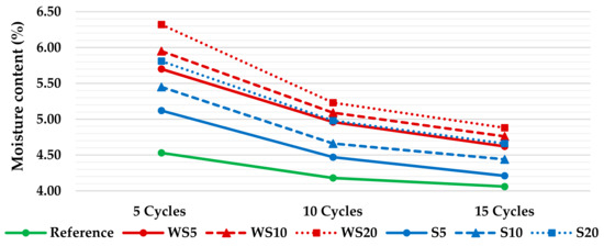 Figure 9. As can be seen, the moisture content of the samples was reduced when the number of wetting–drying cycles increased. This fall was more significant for samples with a higher wood waste content (mainly WS20). In addition, the most important decrease occurred during the first cycle, and was almost stabilized when the 15th cycle was finished. Those results are in accordance with those obtained for the density of the plasters.