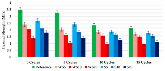 Figure 10. Similar to the density, the increase of the percentage of wood waste added to the plasters meant a decrease in the flexural strength. For all the mixtures, and for the same percentage of waste, mixtures with sawdust showed better mechanical behavior than those with wood shavings. On the other hand, in all cases, the increase in the number of wetting–drying cycles was linked to a significant decrease in the flexural strength of the materials. The fall was more relevant in those composites that contained a lower percentage of wood waste, with the reference material being the one with the biggest drop after 15 cycles (38.9%). It must be considered that, in most of the mixtures, the bending values achieved were higher than the minimum standard requirement (1 MPa) for gypsum plaster, suggesting that is viable to use any of the composites analyzed in construction works [