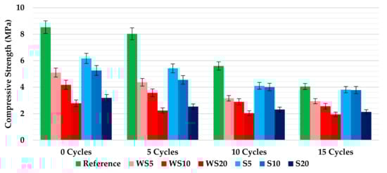 Figure 11, which shows the mean strength values, measured in MPa, at the end of each batch of cycle repetitions. As in the other properties analyzed, the increase in the percentage of wood waste added to the mixtures led to a reduction in the materials’ resistance capacities. The specimens with sawdust showed a better compressive strength behavior than those with wood shavings with the same aggregate percentage. On the other hand, in all cases, the increase in the number of wetting–drying cycles was linked to a significant decrease in the compressive strength of the materials. The fall was more relevant in those composites that contained a lower percentage of wood waste, with the reference material being the one with the biggest drop after 15 cycles (52.5%). Most of the results obtained were above the minimum value required for the compressive strength of gypsum plasters (2 MPa), according to the standard [