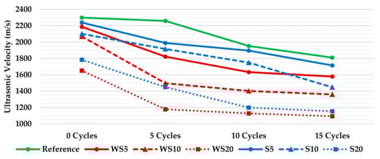 Figure 8, the addition of more wood waste (sawdust and wood shavings), and increased wetting–drying cycles, reduces the density of the plasters. The effects of the wetting–drying cycles in the materials were tested by ultrasonic measurements and the results are shown in