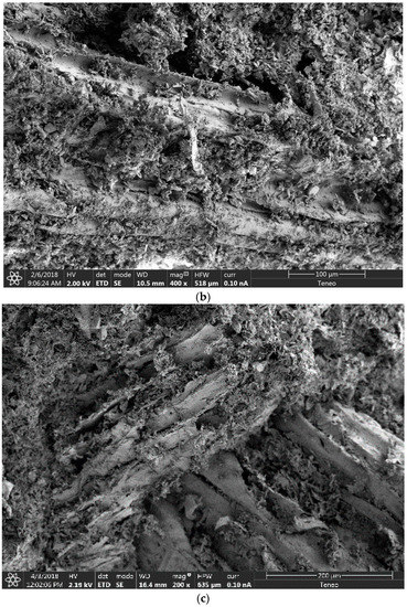 Figure 15 (S20). Apart from the transformation in the crystalline structure of the gypsum matrix, the images showed a progressive surface deterioration of the wood waste. Furthermore, the adherence, between the matrix and the wood waste surface, worsened when the composites were subjected to wetting–drying cycles.