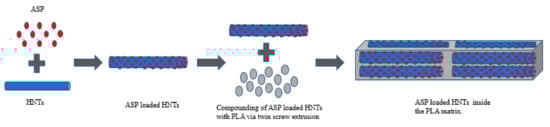 Schematic illustration of PLA/HNTs/ASP nanocomposite by matrix-loading method for batch B2 and B3.