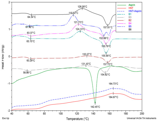 The thermal properties of the nanocomposites following drug encapsulation were analysed using DSC. Figure 5 shows the thermograms of all the batches including the ASP and HNTs for comparison. Aspirin shows its characteristic melting peak at 142.45 °C as expected. However, this peak is not evident in the ASP-loaded HNTs curve.