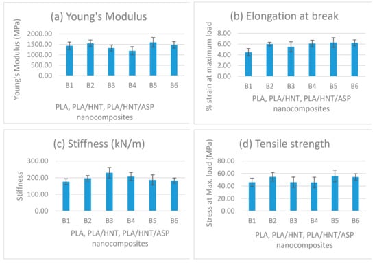 The mechanical properties of the nanocomposites varied with HNT:ASP loading and encapsulation method. The coaxial alignment of HNTs in the PLA matrix enables the efficient load transfer from PLA to HNTs, which improves the mechanical properties.