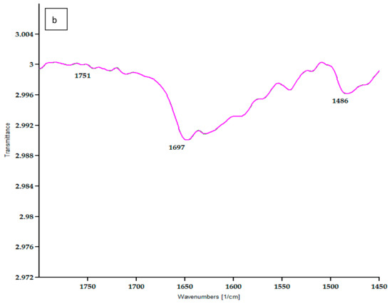 The analysis of the spectra of HNTs, ASP and the ASP lumen-loaded HNTs is shown in Figure 7. The spectra indicate the characteristic peaks of ASP at 1751 cm−1 corresponding to C=O stretching, 1697 cm−1 corresponding to –COO stretch and 1486 cm−1 from antisymmetric stretching vibration of a carboxylate form of aspirin [26,39]. These peaks were observed in the lumen-loaded HNT at 1751 cm−1, 1697 cm−1 and 1486 cm−1. This indicates the ASP molecules had been attached on the HNTs after drug loading.