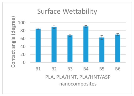 PLA exhibited a hydrophilic nature, whereas HNTs were relatively hydrophobic in agreement with previous work [20,49]. ASP is a hydrophilic drug [32]. The hydrophilicity of B5 and B3 indicate that the loading ratio of 2:1 of HNTs:ASP irrespective of the type of processing decreases the contact angle of the nanocomposites. This could be attributed to the higher agglomeration of HNT which resulted in a lower drug uptake. This could result in a higher amount of ASP in the matrix system which had a plasticising effect and rendered the composite more hydrophilic compared to the 1:1 samples. Similar findings were seen by Patel and researchers in their study with PCL/HNT nanocomposites with antibacterial drugs [27].