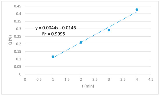 The amount of API released from the lowest to the highest concentration is plotted against the time of release. The graphical representation of the amount of API release (Q%) versus time (t) shows linearity as seen in Figure 9. Thus, the drug release rate is independent of the concentration of the API. In this study, the release kinetics of aspirin showed the best fit for zero-order model (R2 = 0.9995) which represents slow release of drug and is expressed by the equation Qt = Q0 + K0 t where Qt is the amount of drug dissolved at time t, Q0 is the initial amount of drug in the solution and K0 is the zero-order release constant expressed in units of concentration/time. The data obtained from in vitro drug release studies were plotted as cumulative amount of drug released versus time.