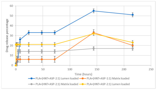 From ASP data, it was shown that the matrix-loaded samples did not have any burst release and that the release began following 8 h incubation, which would indicate that the drug had started to diffuse through the hydrophilic PLA matrix. Conversely, the lumen-loaded samples did have a burst release of 21–28% in the first 1–8 h. This may be attributed to the ASP washing from the outer lumen of the HNT, which were close to the surface of the PLA. In terms of HNT:ASP ratio, and in agreement with drug-loading findings, the 1:1 samples yielded a higher total API release at the end of the nine-day experiment. From the literature, it has been reported that the reduction in initial burst release may be due to the effect of the plasticizer in the polymer matrix [32]. The slow drug release suggests the presence of major amounts of ASP in the lumen of the HNTs at that time point [28]. The thermal properties of test samples in this study show that the matrix-loaded ASP for both 2:1 and 1:1 ratio nanocomposite had negligible cold crystallisation curves, which could be due to the plasticizing effect of the ASP when loaded directly into the PLA matrix. Plasticizers, which are capable of increasing flexibility of the polymers and can reduce the degradation of the thermolabile drugs [4]. The higher percentage of drug release after 140 h can be attributed to the gradual degradation of the PLA which had extended the retention time of the API [15].