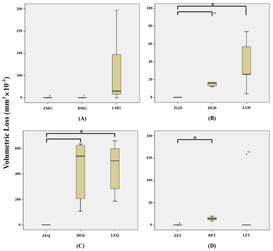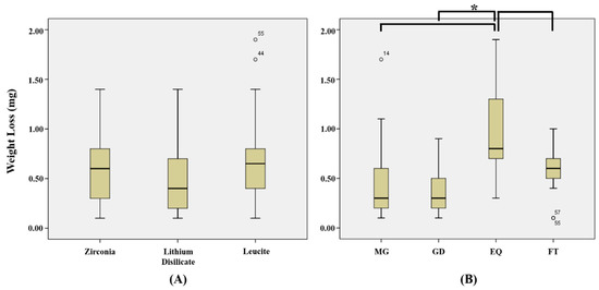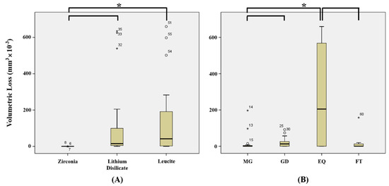 | Ceramic Volumetric Loss (mm3 × 10−3) | Composite Resin Weight Loss (mg) | |