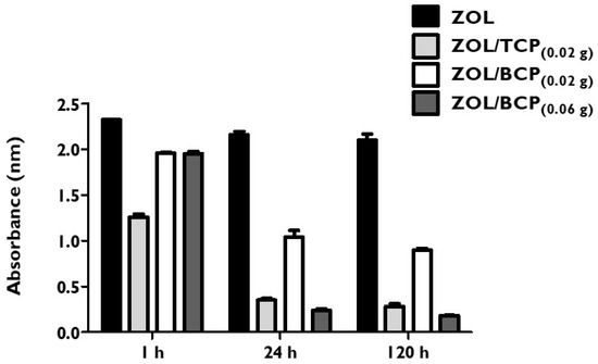 The absorbance of the ZOL solutions remained constant up to 120 h. Furthermore, different light exposures and temperatures did not influence these results (data not shown). The presence of phosphate ceramics led to the alteration of the absorbance spectra of the ZOL solutions, as can be observed in Figure 1.