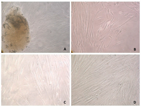 The biopsy fragments gave rise to cells with fibroblast morphology, growing attached to the substrate, bipolar, or multipolar and with elongated shapes. About four weeks after the establishment of the cultures, the cells formed a confluent layer exhibiting a spindle form with a central nucleus. Different phases of the primary culture and cell morphology can be observed in Figure 2.