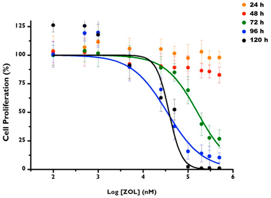Dose-response curves presented in Figure 3 show the cytotoxicity of ZOL after 24, 48, 72, 96, and 120 h of incubation.