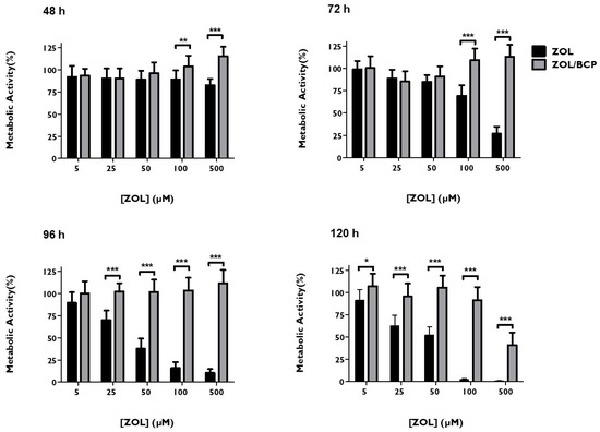 Figure 4. HGF metabolic activity, 48 h, 72 h, 96 h and 120 h after treatment with ZOL and with ZOL/BCP. The results represent the mean and standard deviation of at least six tests. Significant differences are represented with *, where * means p < 0.05, ** means p < 0.01, and *** means p < 0.001.