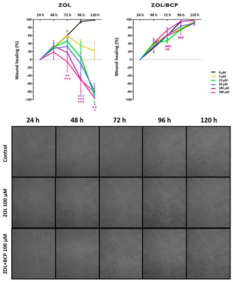 Figure 5. The migration of HGF up to 120 h, comparing cell cultures under treatment with ZOL (left) and with ZOL/BCP (right). The results represent the mean and standard deviation of at least three tests. Significant differences are represented with *, where * means p < 0.05, ** means p < 0.01, and *** means p < 0.001. The images in the bottom of the panel are representative microphotographs of control cell cultures and cell cultures submitted to ZOL and to ZOL/BCP for 24 h, 48 h, 72 h, 96 h and 120 h.