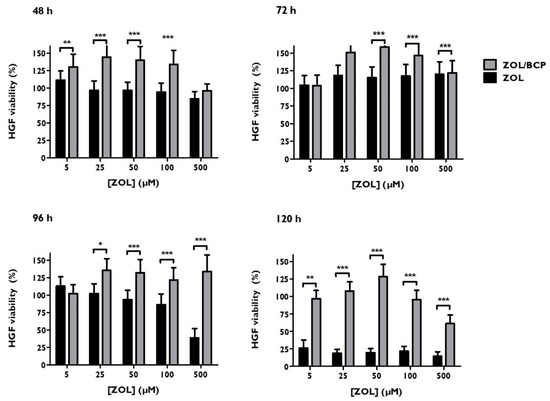 Figure 6. HGF viability, 48 h, 72 h, 96 h and 120 h after treatment with ZOL and with ZOL/BCP. The results represent the mean and standard deviation of at least six tests. Significant differences are represented with *, where * means p < 0.05, ** means p < 0.01, and *** means p < 0.001.