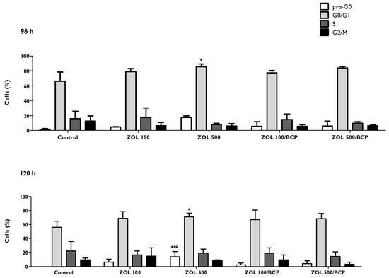 Figure 7. HGF cell cycle, 96 h and 120 h after treatment with ZOL and with ZOL/BCP. The results represent the mean and standard deviation of at least three tests. Significant differences are represented with *, where * means p < 0.05, ** means p < 0.01, and *** means p < 0.001.