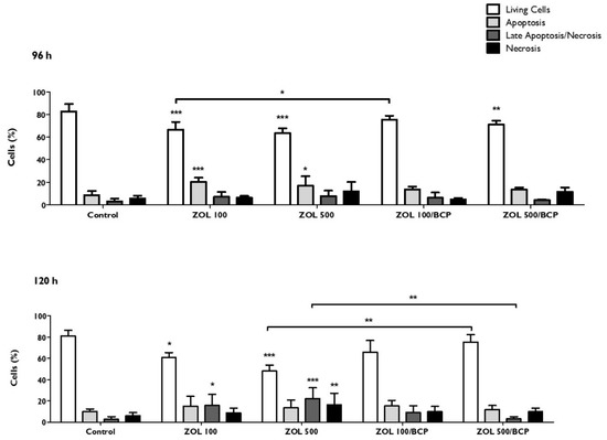 Figure 8. Types of cell death of HGF, 96 h and 120 h after treatment with ZOL and with ZOL/BCP. The results represent the mean and standard deviation of at least four tests. Significant differences are represented with *, where * means p < 0.05, ** means p < 0.01, and *** means p < 0.001.