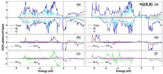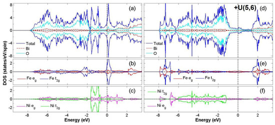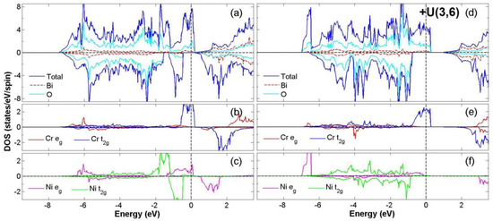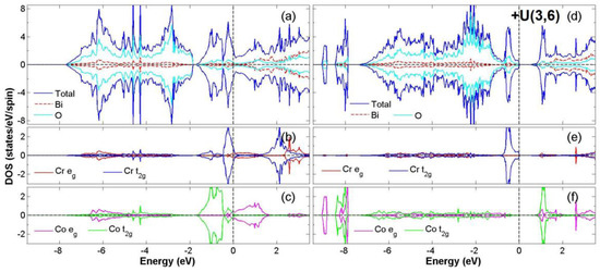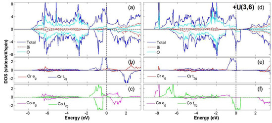 In this section, we select two compounds, Bi2CrCoO6 and Bi2FeNiO6, as examples to discuss AF-based calculations because of their final stable states, with GGA + U schemes belonging to AF rather than FM. We illustrate the distribution of DOS and PDOS of Bi2CrCoO6 and Bi2FeNiO6 in Figure 9 and Figure 10, respectively. Comparing the states of Bi2CrCoO6 in Figure 3 with Figure 9, the GGA+U scheme has changed the compound from a FM-HM to a stable AF-Insulator (AF-IS). Meanwhile, the GGA + U scheme changed Bi2FeNiO6 from a FM-HM to a stable AF-Metal as shown in Figure 5 and Figure 10. When considering the AF-based states, the total magnetic moment is zero because the magnetic alignments of B and B′ are anti-parallel, as shown in Table 2. Thus, this table only lists the magnetic moment for one site of B and B′ and omits another site. In addition, for analysis of stability, the energy level of AF-IS Bi2CrCoO6 (GGA + U) is −61.827 eV/f.u. and AF-metal Bi2FeNiO6 (GGA + U) is −57.083 eV/f.u., shown in Table 3.