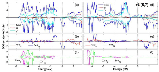 Calculated FiM-Bi2FeZnO6 total DOS (a) and partial DOS of eg and t2g spin orbitals for Fe (b) and Zn (c) under GGA and FM-Bi2FeZnO6 total DOS (d); partial DOS of eg and t2g spin orbitals for Fe (e) and Zn (f) under GGA + U (Fe = 5, Zn = 7) schemes.