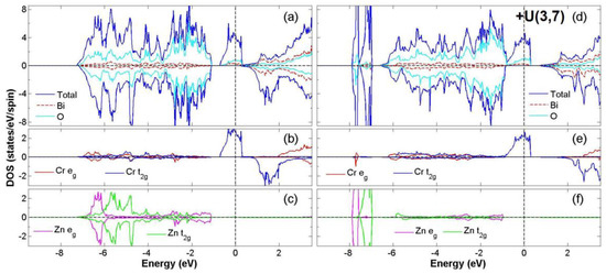 Figure 7 illustrates the density of states (DOS) and PDOS of Bi2CrZnO6 for both GGA and GGA + U (Cr = 5, Zn = 7) schemes. With the GGA scheme, the hybridization between the Cr 3d and O 2p orbitals occurs mainly in the energy regions −7.0 eV to −1.0 eV and −0.5 eV to 0.5 eV, as shown in Figure 7a. Principally near the Fermi level (EF), a spin-splitting at the spin-down channel and integer magnetic moment of 2.0 μB/f.u. is regarded as the main features of HM. This asymmetry of the Zn eg at the Fermi level gives Zn a weak magnetic moment, induced as −0.013 (GGA) and −0.008 (GGA + U) μB/f.u. These factors result in the FiM state. Next, we investigate the distribution of the electron configuration, for which the ideal model of Bi2CrZnO6 is Cr4+(3d24s0: t22ge0g) at S = 1, Zn2+(3d10: t62ge4g) at S = 0. According to the following calculations, the total electron numbers of d orbitals for Cr and Zn are 4.4 and 10.0, respectively. This gives the valence states of Cr+1.6(3d4.4) and Zn+2.0(3d10.0). Considering the electron configuration with GGA + U scheme, it is also similar to the configuration with GGA. After GGA + U, the spin-down band gap slightly widens due to a shift in the Cr t2g orbital and △E remains negative, showing a stable FiM-HM state. Similar to Bi2FeZnO6, illustrated in Figure 6, Bi2CrZnO6 is regarded as a stable FiM-HM for both GGA and GGA+U schemes.