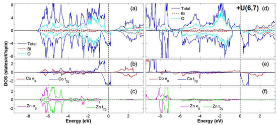Calculated FiM-Bi2CoZnO6 total DOS (a) and partial DOS of eg and t2g spin orbitals for Co (b) and Zn (c) under GGA and FM-Bi2CoZnO6 total DOS (d) partial DOS of eg and t2g spin orbitals for Co (e) and Zn (f) under GGA+U (Co = 6, Zn = 7) schemes.