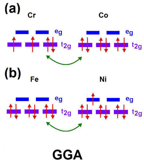 In these compounds, the p orbitals of Oxygen have two kinds of energy distributions for DOS. For example, in Bi2CrCoO6, the hybridization between Cr t2g, O 2p, and Co t2g orbitals occurs mainly in the two energy ranges −7.5 eV to −2.5 eV and −2.0 eV to 0.5 eV, as illustrated in Figure 3a. The localized spin-to-spin interaction of double exchange was inferred from the interaction of Crt2g-O2p-Cot2g. Such DE effect enhances the HM property of Bi2CrCoO6. Likewise, in Bi2CrCoO6, a band gap exists at the spin-down channel with the GGA scheme, but the gap disappears and its FM state becomes unstable once GGA + U is applied, thus losing its half-metal properties.