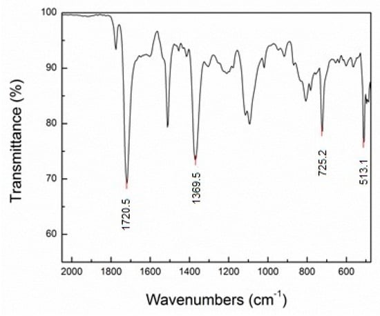 Using the IRAffinity-1 spectrometer (Shimadzu, Kyoto, Japan), the spectra obtained was in the infrared radiation (IR) middle region of 4000–400 cm−1. The two main chemical bonds observed are: fingerprint on the 1500–600 cm−1 region, and double bonds on the 2000–1500 cm−1 region where carbonyl stretching can be recognized. Figure 2 displays the most intense peaks from the spectrum.