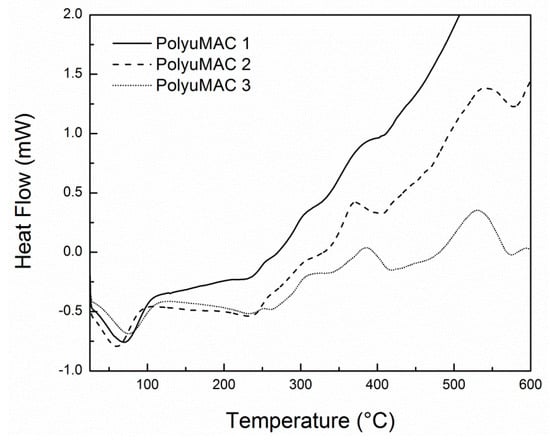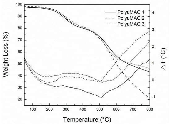 The TGA/SDTA851e thermo-gravimetric analyzer (TGA, Mettler–Toledo, Columbus, OH, USA) allowed the thermal characterization of the PolyuMACTM. Via the said TGA, we determined the thermal stability of the polymer by identifying at which temperature moisture evaporates from the sample without affecting the material’s structure. Three PolyuMAC™ samples of different weights (namely 7.42, 9.57, and 10.14 mg) were tested at 2.0 °C/min, with a lower limit of 26.59 ± 0.27 °C and an upper limit of 947.80 ± 0.27 °C. In addition, a simultaneous differential thermal analysis (SDTA) permitted to study the chemical, physical, and softening transition of the polyimide samples. Figure 3 shows the behavior of a thermoset polymer with curves representing typical multistage decomposition.