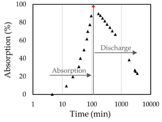 The polyamide density was performed according to the ASTM D3574 [21] and its mean value was of 5.922 kg/m3 with a standard deviation of 0.325 kg/m3, and a median of 5.821 kg/m3. The experimental setup for absorption test was segmented into drying and saturation. Drying was performed in an oven for 10 min at 100 °C using the TGA results as reference. Then, the sample was transferred inside the glovebox where the humidity and temperature were constantly monitored to ensure a controlled system experiment. Inside the glovebox there was a precision balance and a spray nozzle with an attached syringe filled with methanol. This worked as a piston pump balancing the pressure inside the mechanism after the fluid was sprayed allowing collection of the exact volume being sprayed on the top of the sample. Water is commonly used for absorption tests. However, we opted to use methanol for its lower surface tension, which allows the alcohol to flow through the foam easier than water. Thus, the foam specimen was wet with a mist of methanol with a known volume to assess the absorption capacity of the material. One must underscore that the sample was dried prior to any test and, thereupon, saturated with methanol, which was confirmed when the foam started dripping (~113 min). After saturation, the sample was weighed to assess the fluid discharge. In addition, a control sample that was simply exposed to the environment was also placed inside the glovebox. No significant changes were observed in the control sample. The samples were weighed at each step of the process. The samples’ dimensions were 51 mm in length, 64 mm in diameter and had an average dry weight of 0.714 g according to the absorption test. The temperature inside the glovebox was 21.9 ± 0.14 °C and the humidity increased slowly with respect to time at a rate of ~0.033% min−1. Figure 5 shows an example of the behavior obtained from the sample.