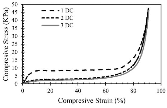 The dynamic compression properties were determined according to ASTM D1621-10 [22]. An Instron® 5944 allowed the compression tests to be carried out. As mentioned, the samples underwent compressions of 30%, 60%, and 90% of its original length on the foaming direction. At each percent, the samples were dynamically compressed (DC) through one, two, and three cycles. The deformation rate was 50 mm/min. The standard compression test suggests that the compressive strength is the stress at 10% deformation. This stress value represents the yield point and was identified on the plots acquired from this test. The Instron Bluehill® software (version 3.25, 2010, Norwood, MA, USA) provides the plot of compressive stress and compressive strain (Figure 6). Young’s modulus seen in Table 2 is observed on the linear elastic region of the plot. The slope is measured as the ratio between change in compressive stress and strain. As expected, since the compression percent of the foam raised their densification, the mechanical strength of the material also rose [23].