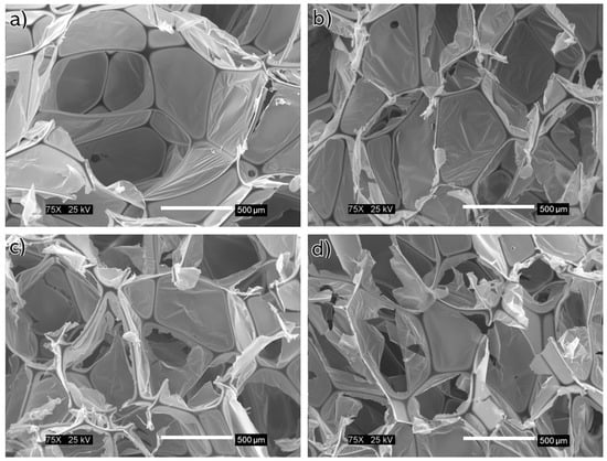 Scanning electron microscopy (SEM) images of foam samples: (a) as provided, (b) after one dynamic compression to 30% of its length, (c) after two dynamic compressions to 30% of the original length, and (d) after three dynamic compressions to 30% of its length.