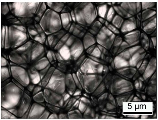 Quantitative image analysis allowed the porosity to be measured (Figure 8), which normally has a value of 99% for acoustic insulators [2]. Micrographs of the samples were obtained using a SMZ1500 stereomicroscope (Nikon, Melville, NY, USA) with diascopic stand, furbished with a shadow free Fiber-Lite MI-150 top illumination, and a V-Lux compact cold light source to complement the Fiber-lite. Afterwards, the porosity was determined using the ImageJ software. Porosity () is defined as a volume fraction, according to Equation (1):