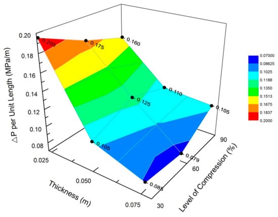 In our research, our empirical model used the pressure difference as an analogous approach for a resistivity factor. In effect, one can observe in the surface plot of Figure 10 that the pressure drop changes with the sample length and compression percent. According to Darcy’s Law, the parameters involving pressure drop can describe the effect of the fluid velocity passing through the interconnected open cells. A lower value of permeability can then be considered as a lower flow rate of the fluid phase through the solid phase. The tortuosity barely fluctuates between dynamic compressions because of the almost constant porosity parameter, as explained before. On the other hand, the permeability increased with the sample length. Hence, the slope obtained in the linear fit per unit length resulted in an inverse relationship between and . The slope is affected by the permeability. Samples with 76 mm (3 in.) length had more volume than samples with 25 mm (1 in.) length; hence, the pressure drop was higher in the 76 mm samples, justifying the hypothesis of a velocity attenuation as the fluid flows through the porous media at a constant rate.
