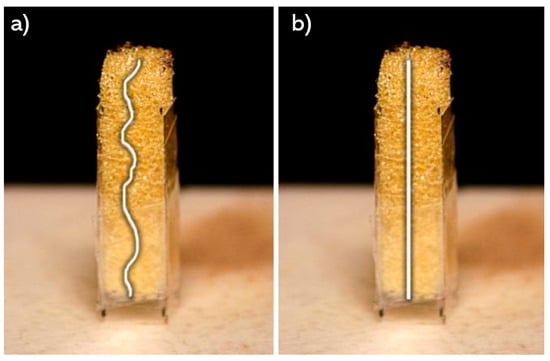 Fluid/solid interaction can be simplified as the ratio of path length of fluid () through the porous media and the sample length (), as shown in Figure 11. Therefore, a higher tortuosity index justifies a more complex path for the fluid, which one interprets as better insulation capacity. The tortuosity index cannot be equal to one because such occurrence would mean that a material lacks a tortuous path. The interaction between these two continuums can be explained through the Pi theorem via experimentation to calculate a tortuosity response. An analysis of variance (ANOVA) and regression permitted to identify regression equations and determine which one possessed the most suitable (largest) coefficient of correlation [27].