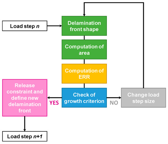 The delamination growth simulation strongly depends on the size of the elements. The delaminated area can generally be under- or overestimated. Through the combination of three separate and interacting moduli, the SMXB technique is able to change the local coordinate system related to each node, belonging to the delamination front, to properly determine the virtually released area. This allows it to equate the numerically evaluated delaminated area with the area that should be released to reach Ed = 1. Furthermore, the peaks in the strain energy release rate that occur at corner nodes, due to the change in the delamination front’s shape, are avoided by estimating the energy release rate on the delamination front’s segments, rather than nodes. In Figure 1, a flowchart representing the SMXB workflow is shown. The detailed description of SMXB features is reported in [12,13].